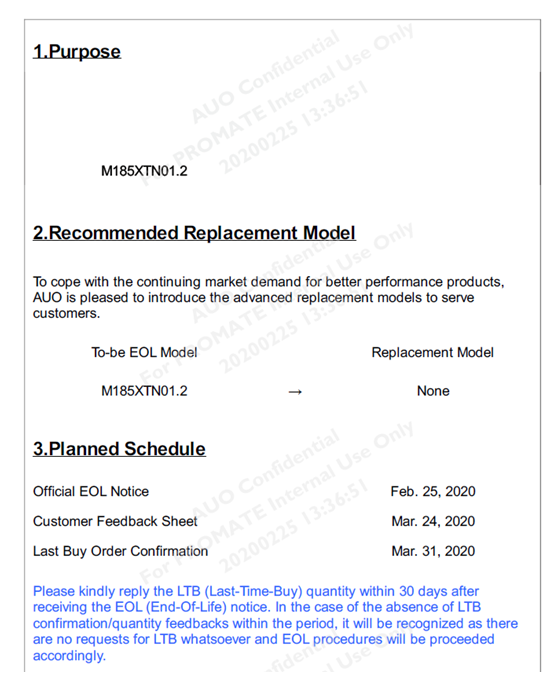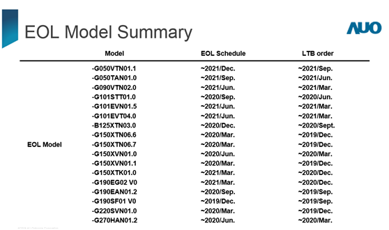 AUO友達工業(yè)液晶屏2020年Q1 EOL Procedure